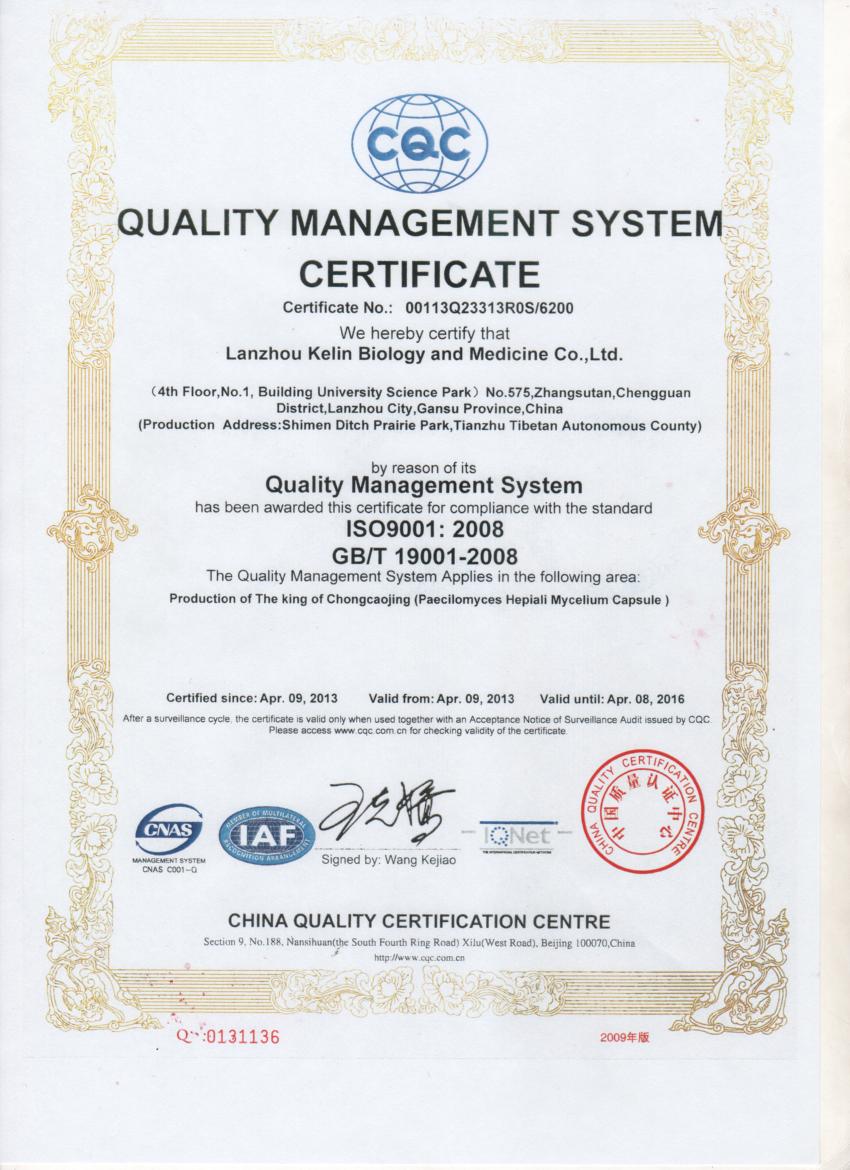 Kelin bio through the ISO9001:2000 international quality management system certification, the Chinese Academy of Sciences Institute of microbiology test report for the record of foreign trade managers, France that high quality of Cordyceps sinensis.